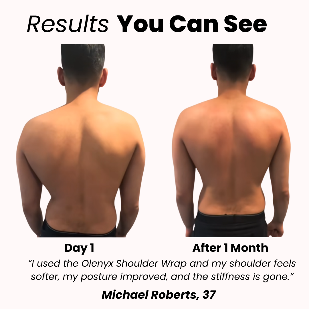Most users begin to feel relief from muscle tension and stiffness within the first few sessions of using the Olenyx™ Shoulder Wrap. With daily use, improvements in blood circulation, reduced neck and shoulder discomfort, and less overall fatigue become noticeable. After 2-3 weeks of consistent use, many people report significantly less tension, increased mobility, and an overall sense of well-being. By six to eight weeks, the results are more long-lasting, with muscles staying relaxed throughout the day, greater comfort during daily activities, and even better sleep quality. For optimal results, it's recommended to use the device daily for about 15 minutes, ideally paired with light stretching or a calming routine.